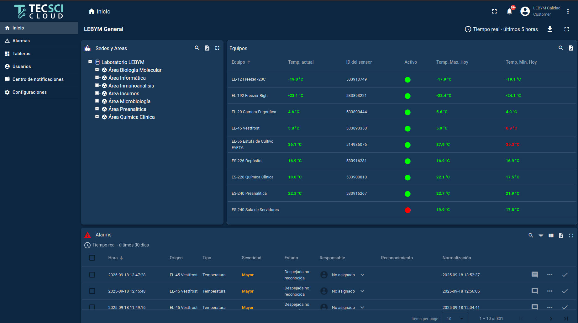 El sistema abrirá el panel de control (dashboard) predefinido para su usuario. Allí podrá ver los diferentes edificios y areas en el panel de la izquierda y a la derecha los equipos pertenecientes al area seleccionada.