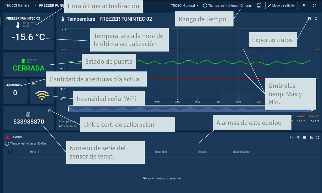 Si la alarma se encuentra ACTIVA significa que el problema aún persiste: la temperatura sigue fuera de rango, la puerta continúa abierta, el dispositivo está inactivo. Si el estado es NORMALIZADA significa que el sistema ya volvió a su estado normal luego de haberse desviado: la temperatura volvió al rango aceptado por ejemplo.
