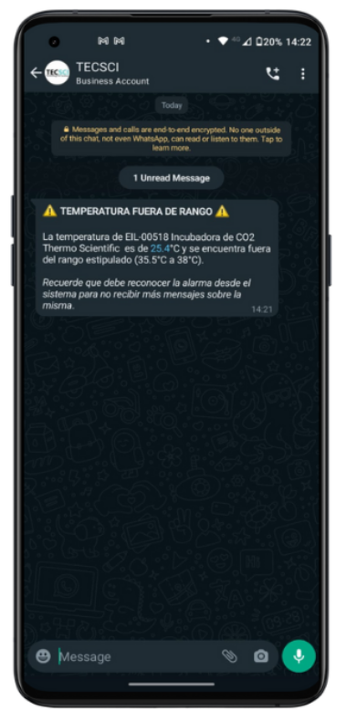 Al disparse una alarma, luego de cierto tiempo se emite una notificación por e-mail y whatsapp a los usuarios responsables del area a la que pertece el equipo. Se reciben alertas de temperatura fuera de rango, puerta abierta, inactividad. Es posible configurar el tiempo de retardo para dar aviso; por ejemplo, avisar que una puerta está abierta si pasan más de 5 min.